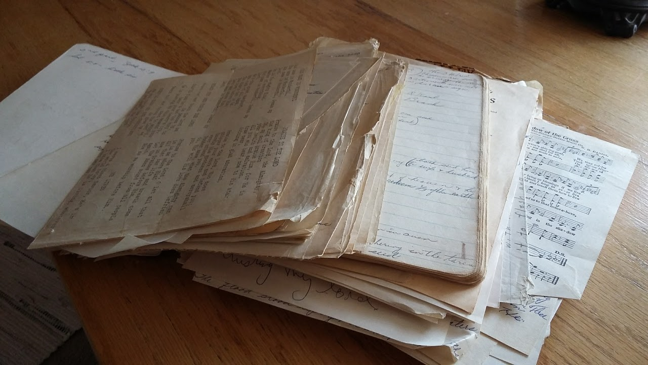 She took it to church stuffed with lyrics, choruses, hymns, and worship songs.  Some pages are from old hymnals, but others are typewritten sheets or handwritten scraps on the back of old browned pieces of paper.